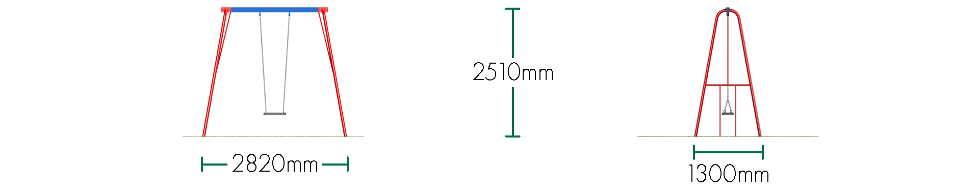 Safety surface area dimensions above are for wet pour surfacing (synthetic). If loose fill is being used the length needs to be increased to 7.7m (from 6.7m) to allow an extra 500mm of surfacing at either end.