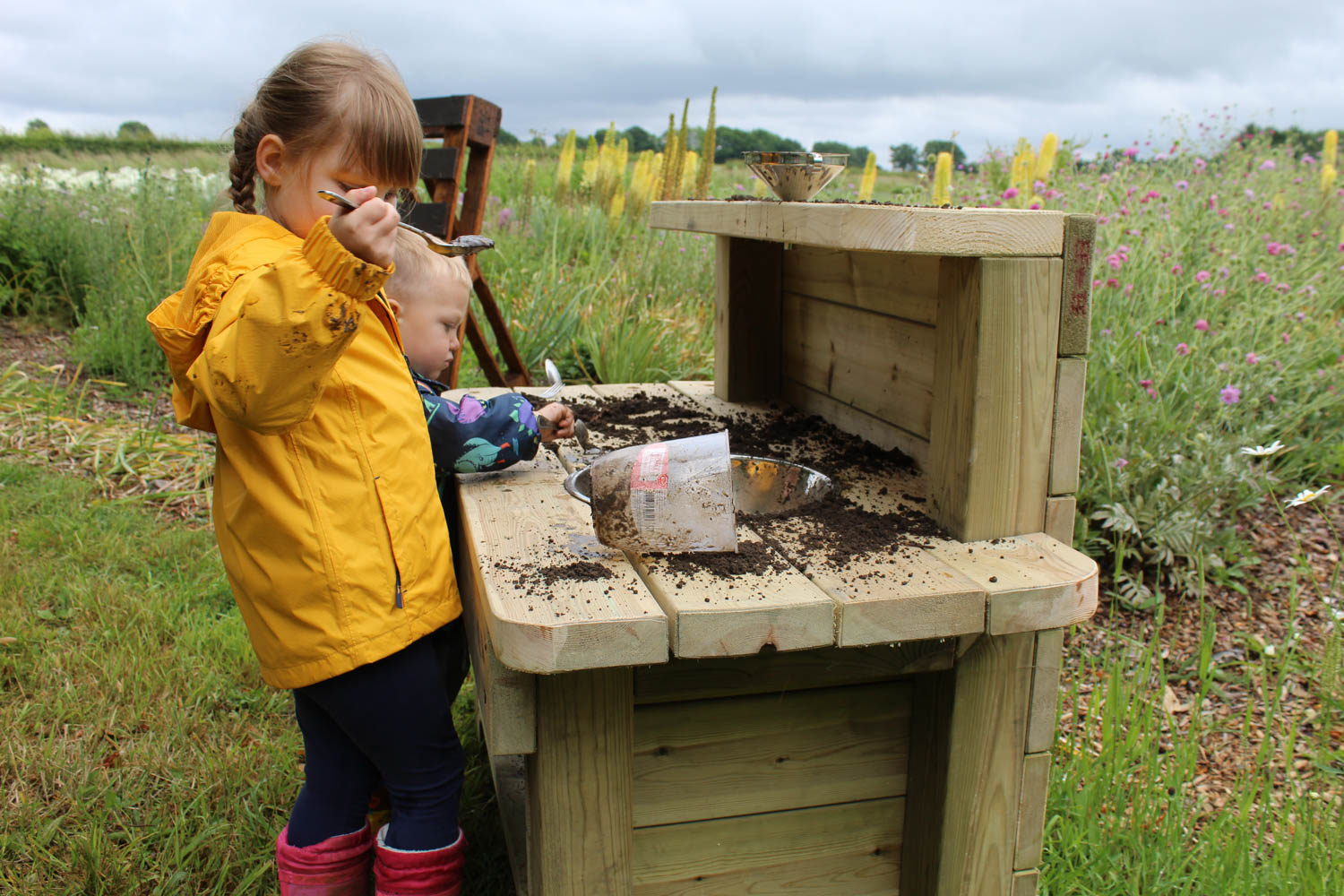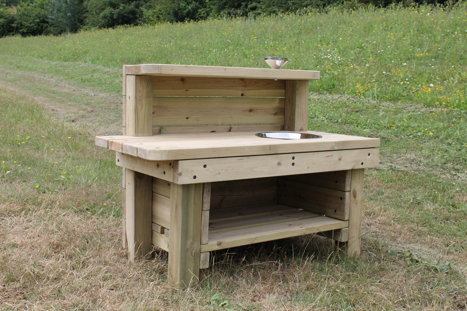 Our larger Mud Kitchen version, the Messy Mud Kitchen is chunky and robust and includes x2 stainless steel bowls and shelves!
